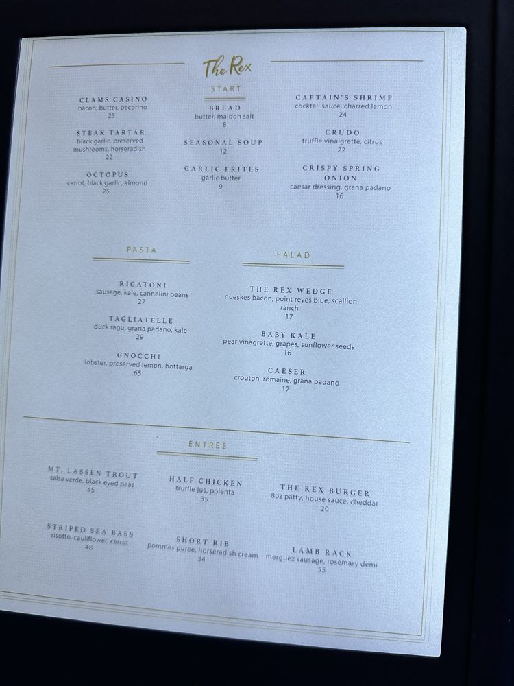 “ One of my favorite restaurants! Everything is right with the world when eating at Rex, from Chef Walter's AMAZING offerings to the hospitality of folks like Aaron and Chase! For me, it's about a 45 minute drive to get there, but worth it as that porterhouse that melts in your mouth helps you forget your traffic woes. This is another nice restaurant where the music isn't blasting so you can really enjoy some great food and conversation over their cool, crafted cocktails and fine wine selections. They also feature delicious non-alcoholic selections for those who have to do the driving. In addition to some cozy indoor dining, The Rex has patio seating, so feel free to bring the whole crew. With the beach just a block away, the stage is set for a wonderful after dinner stroll as well. Thanks Chef Walter and thanks Rex! What are you waiting for? ”